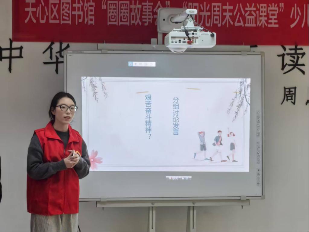 在互动环节,志愿者们通过有奖问答的方式,带领小朋友们回顾并梳理故事细节,帮助小朋友们进一步理解故事情节。此外,志愿者给小朋友们推荐了《少年中国说》《雷锋的故事》两本书,希望小朋友们用心体会红色精神,传承红色基因。