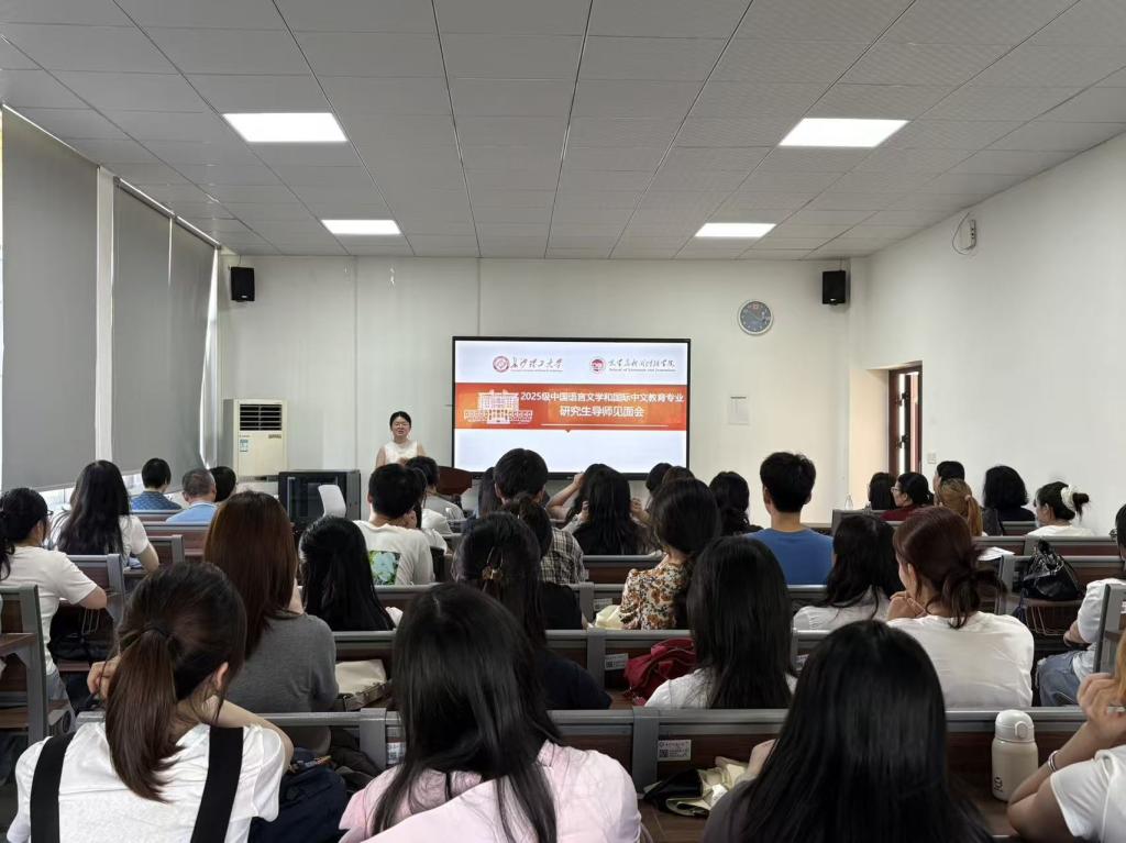 9月16日下午,2025年新澳门原料网站文学与新闻传播学院中国语言文学与国际中文教育专业2025级硕士研究生导师见面与双选会在金盆岭校区九教417成功举行,文学与新闻传播学院中国语言文学与国际中文教育专业全体研究生导师及研究生新生参与了此次会议,文学与新闻传播学院党委委员兼中文系主任黄婧主持此次会议。