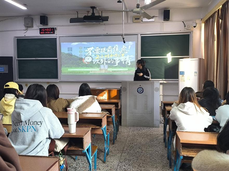 班会中,主讲人从焦虑的本质、遥远担忧的危害、聚焦当下的方法三个维度展开讲解,通过真实案例与实用技巧相结合的方式,让同学们明白焦虑源于对未来的过度投射,而破解关键在于立足当下。主讲人重点介绍了“明确问题距离感”“百事清单法”等实操方法,引导大家将注意力转移到可控制的当下行动中。班会的最后,为了让同学们了解到专业支持渠道,她还详细介绍了学校免费的心理资源。