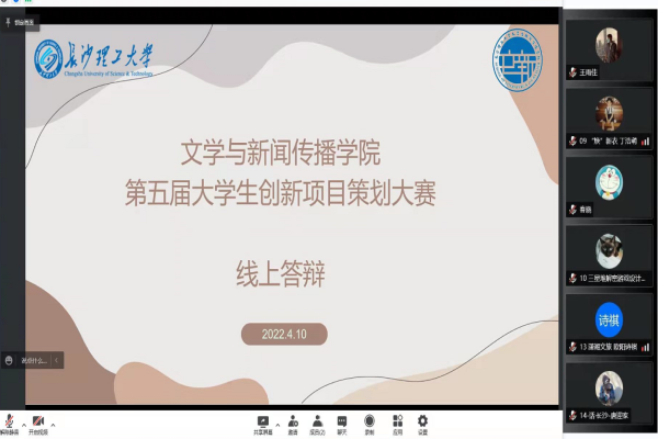 2022年4月10日晚,文学与新闻传播学院成功举办第五届大学生创新项目策划大赛院内选拔线上答辩会。此次答辩会由学创部组织,10个项目团队根据抽签顺序依次展开答辩,副院长王雨佳、新闻专业老师王春晓、院团委书记李敏担任评委。