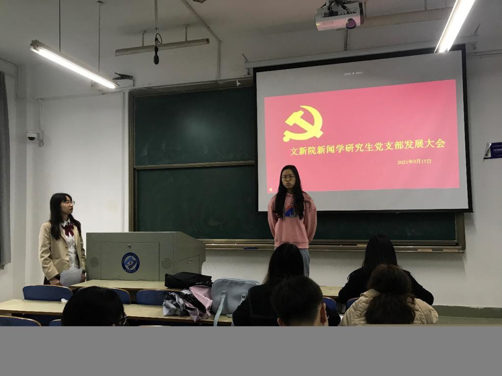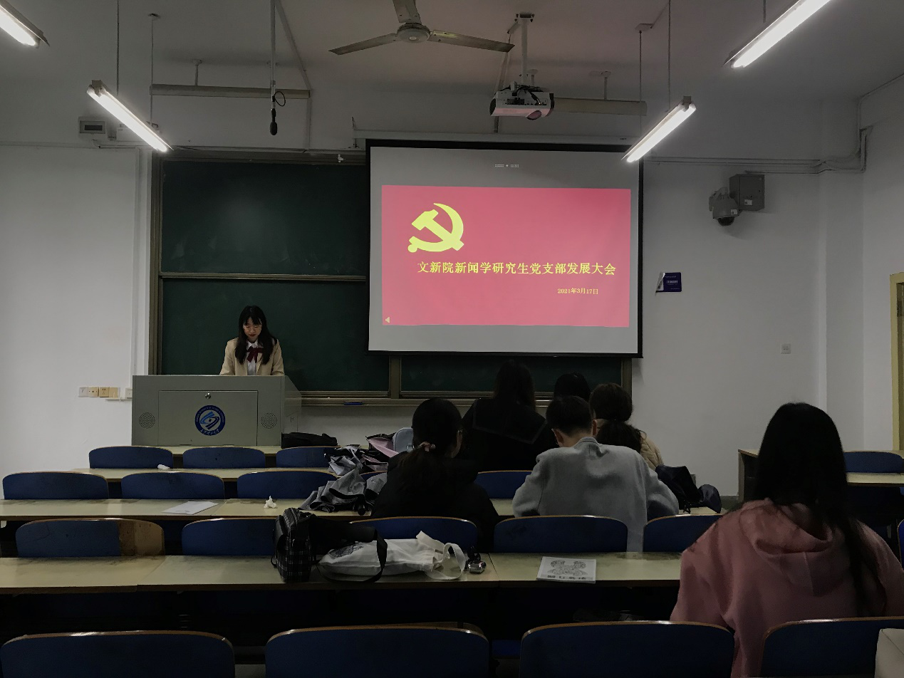 2021年3月17日下午,新闻学研究生党支部在金盆岭校区6教203召开了预备党员接收大会。会议由支部副书记邬丽主持。