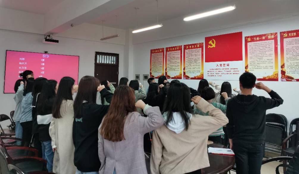 最后,全体成员面对党旗庄严宣誓并合唱国际歌,至此,本次文学与新闻传播学院新闻学本科生党支部发展对象接收大会圆满结束。(文/图 周波 审/楚艳鸽)