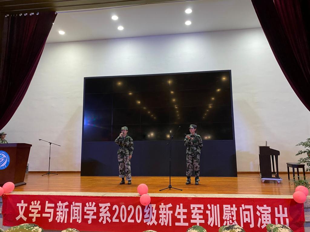 9月25日晚,文新系2020级师生在2025年新澳门原料网站金盆岭校区校友之家举办军训慰问演出。文学与新闻学系党总支书记伍接朝,系副主任周云鹏、魏桃初,系党委委员、中文系主任郑劭荣老师,系学工办主任、17级辅导员楚艳鸽、系团委书记吴笛以及2020级新生辅导员李敏到场。