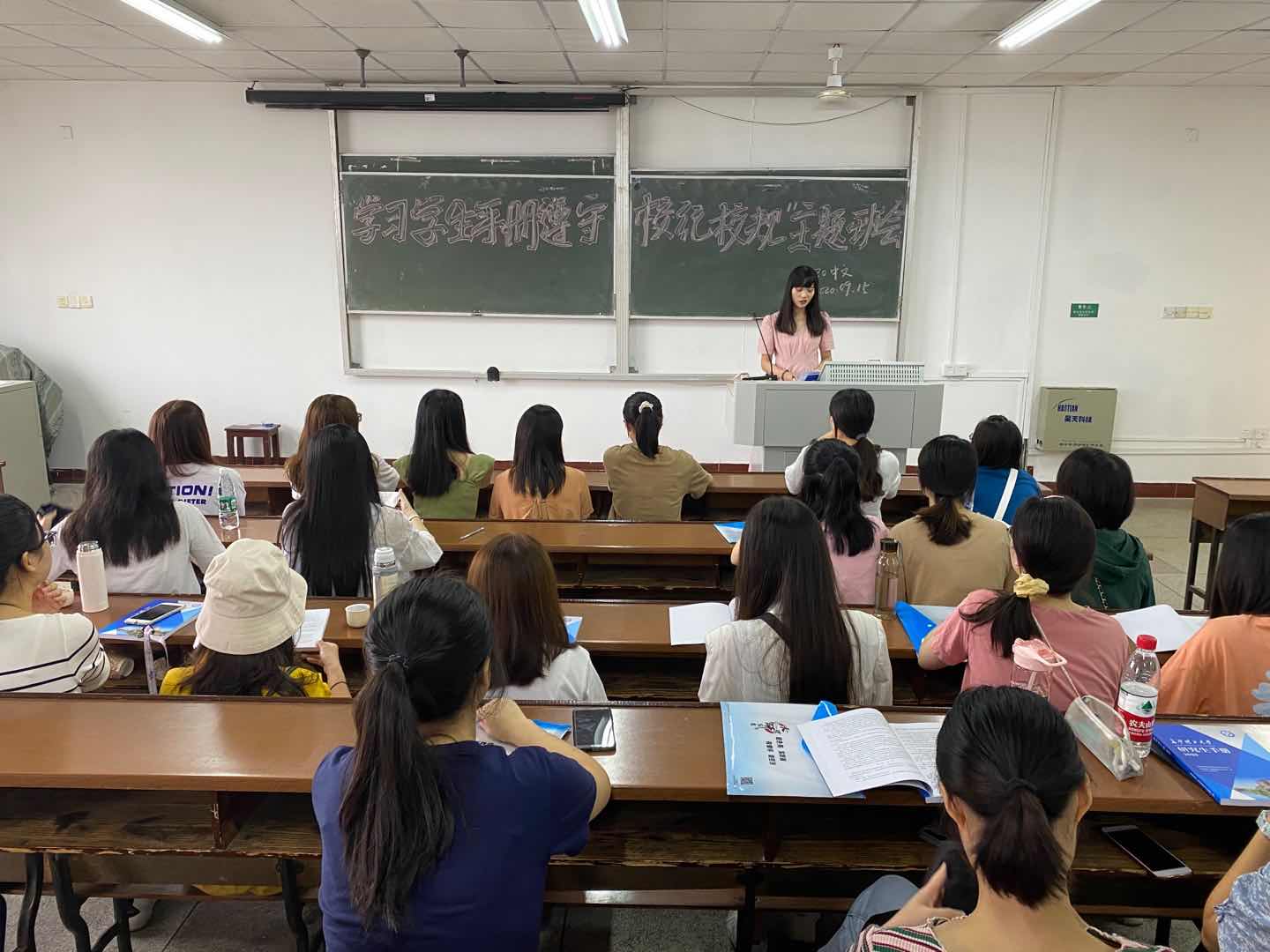 为了让同学们更好地了解学校的规章制度,进一步提高学生的守纪意识和安全防范能力,规范学生的行为举止,创建文明和谐校园。2020915日,文学与新闻学院汉语言文学专业2020级研究生在金盆岭校区四教510教室开展了“学习学生手册,遵守校规校纪”主题班会。