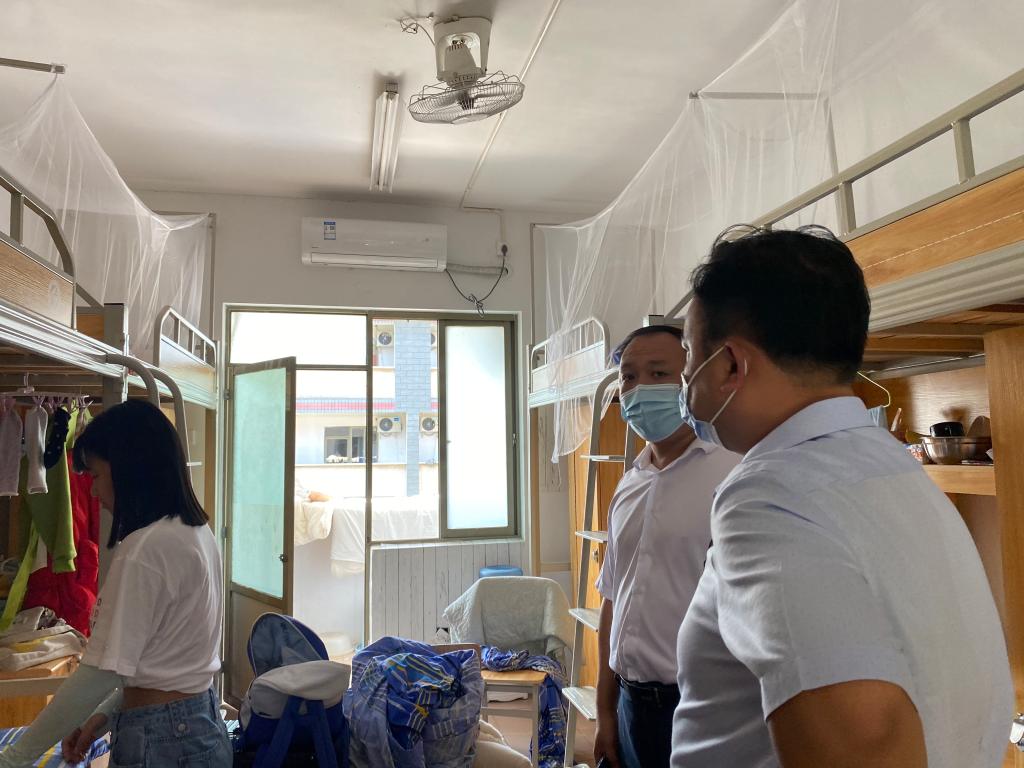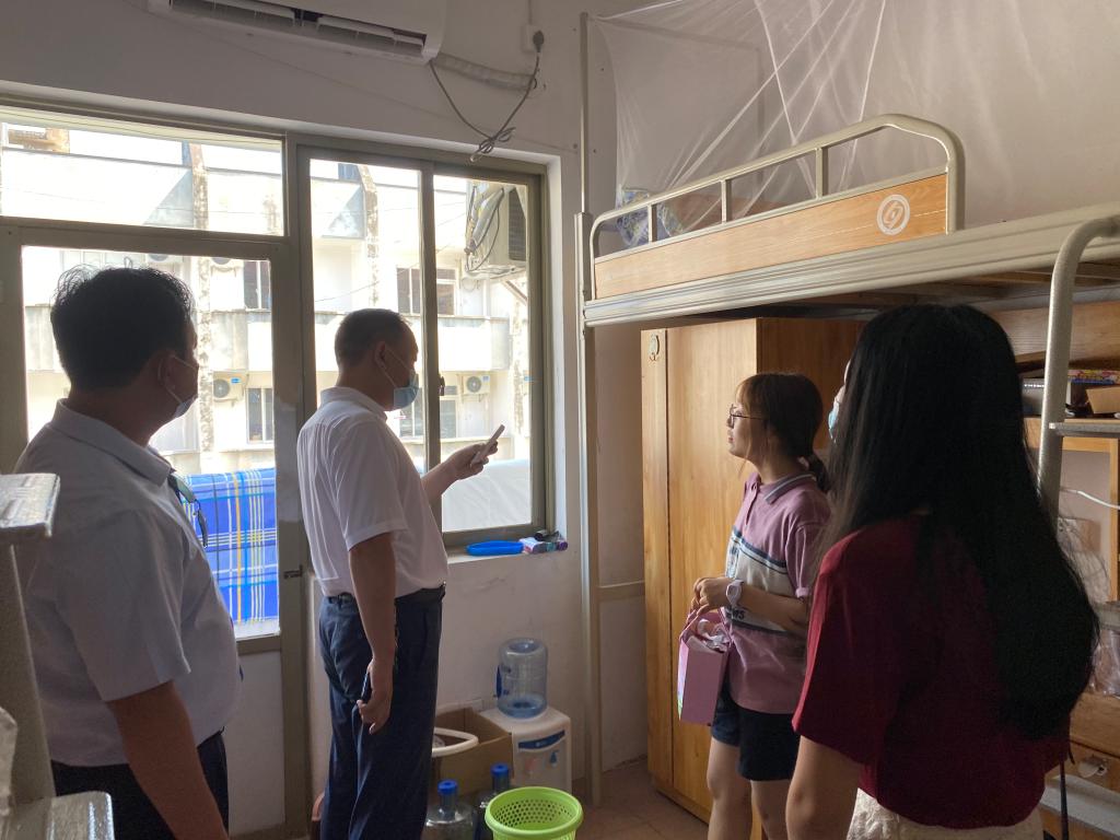 贺部长和伍书记走访了返校学生的宿舍,与同学们面对面交流沟通,了解了同学们的返程情况和返校后的安排及需求,解答同学们提出的相关问题,并叮嘱同学们要遵守学校相关规定。辅导员刘洋提醒同学们提前收拾好宿舍行李,为搬校区做好相关准备,同时她嘱咐同学们在家期间上课方式为网上教学,开学后的考试要认真准备好。