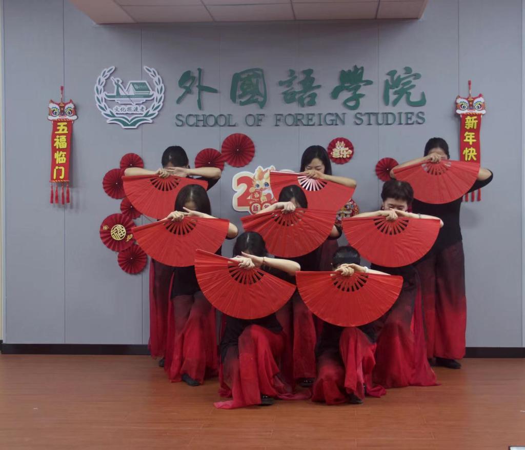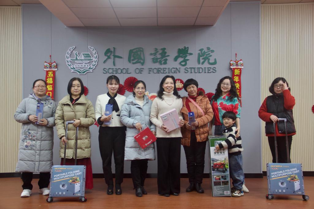 会议第二阶段,由学院李巍、易平、龙晓翔、陈若晨四位老师主持新春团拜会,学院各系部教师代表上台表演节目。学院行政的老师以一首《教师阵线联盟》描述教师工作的“苦中作乐”,英语系的教师用诗朗诵的方式表达着中国话的魅力,公共外语二教研室的老师们用三句半的方式描述学院搬迁的场景,退休教师郑延国教授现场赋诗一首……形式多样、内容丰富的节目将活动气氛推向高潮。活动现场设有多轮表彰与抽奖环节,对过去一年在本科教育审核评估、教研教改、学科竞赛、就业考研帮扶等各方面表现突出的教师进行表彰,发挥模范带头作用,勉励更多教师参与到学院内涵发展、文化建设、人才培养等工作中来。