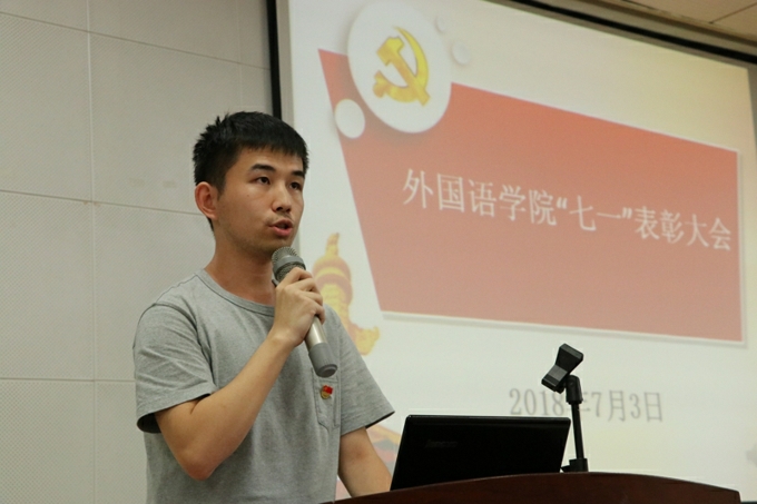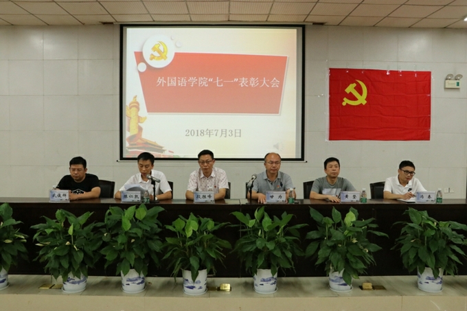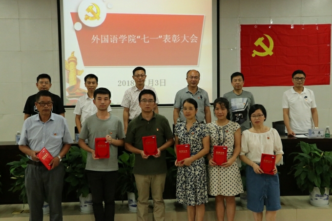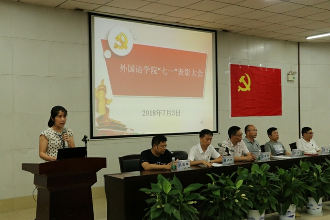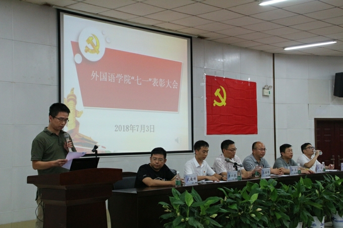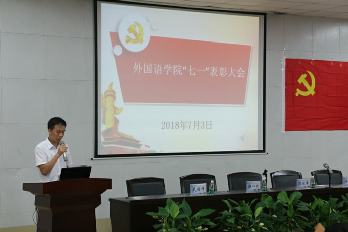 学院党委书记甘为宣读表彰决定,公共外语提高部党支部和本科生党支部获评“先进党支部”,谷丰等7名教职工党员和田帅等9名学生党员获评“优秀共产党员”。主席台领导为获奖党支部和党员颁奖。