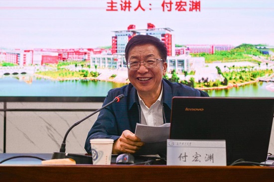 在书记领学环节伊始,付宏渊通过视频带领与会师生回顾了中国当代史,展示出当今中国的飞速发展。随后,他从百年大变局下中国的发展、百年大变局下的国际比较、怎样看世界与今日中国三个方面进行讲述。在百年大变局下中国的发展方面,付宏渊指出中国特色社会主义制度的巨大优越性,中国的崛起需要世界和平的环境,且对核心技术的攻关是当代学生所面临的使命。在百年大变局下的国际比较方面,付宏渊对中美两国选举制度、价值观进行了比较。在怎样看世界与今日中国方面,付宏渊指出中国正面临百年未有之大变局,中华民族正面临着实现中国梦的大变局。结合我校在“十四五”规划中提出的一个目标、“分两步走”战略、三大重要基地、四个发展、五条道路等部署,付宏渊勉励青年学子要关注国家大事,胸怀世界与中国,在学习中国历史的过程中激起奋发有为的动力。领学最后,付宏渊向同学们提出两点期待:其一为“读书是最好的修行,要在学习中开拓视野、坚定理想”;其二为“不要让功利桎梏了飞翔的翅膀,要树立为民族复兴贡献力量的远大理想”。