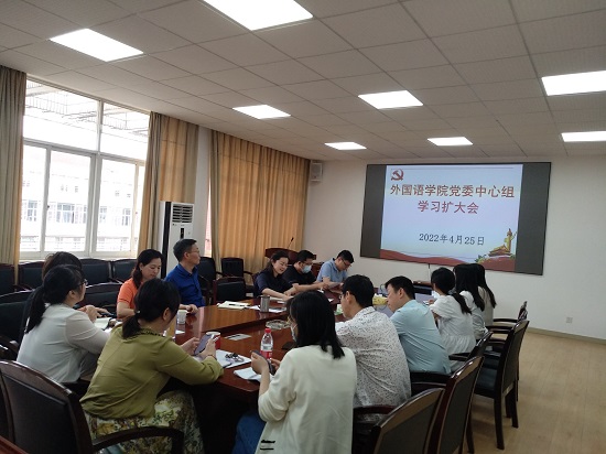 4月25日下午学院在文科楼A-603会议室召开党委中心组扩大学习,会议由学院党委书记文丽丽主持,学院班子成员、党委委员、纪委委员、工会副主席、教工党支部书记、学生党建辅导员、团委书记等参加会议。
