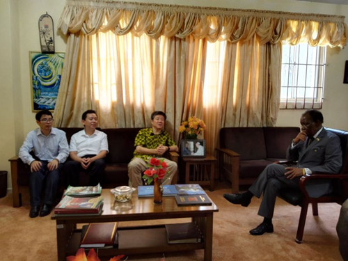 当天上午十一点整,张越大使抵达利比里亚大学。张越大使在利比里亚大学副校长Dr.Julius S.Nelsen、孔子学院中方院长黄柏青博士、外方院长助理Dexter、中方教师明皓老师等陪同下首先查看了孔子学院和我国驻利比里亚防暴队、利比里亚武术协会联合举办的武术和文艺表演场地,并就如何做好演出做出重要指示。在随后会见利比里亚大学校长Dr.Emmet A. Dennis时,张越大使充分肯定了孔子学院工作在中利两国文化交流中所起的重要作用,表示坚定支持利比里亚大学孔子学院发展,并愿积极推动在利比里亚大学建立中文系及中文专业。