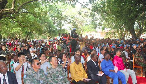 11月11日,利比里亚大学孔子学院承办的“中利两国武术交流大型文化活动暨大使奖学金、企业奖学金颁奖典礼”在利比里亚大学的国会山校区如期举行。出席活动的有中国驻利比里亚张越大使,利比里亚教育部部长Mr. George K. Werner(沃纳先生),利比里亚大学校长Dr. Dennis(丹尼斯博士)、副校长Dr. Julius Nelson(尼尔森博士),利比里亚武术协会主席Mr. Pratt(普拉特先生),利比里亚孔子学院中方院长黄柏青博士,外方代理院长Mr. Dexter(德克斯特先生),防暴队徐晓伟政委以及各中资企业代表,利比里亚大学及其他多所高校的师生及民众共两千多人。