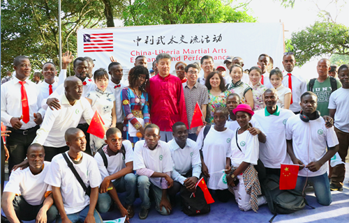 之后举行的是武术交流及表演。节目主要由联合国驻利比里亚中国防暴队、利比里亚武术协会和利比里亚大学孔子学院师生共同表演。联合国驻利比里亚中国防暴队与利比里亚武术协会带来的中国武术系列表演精彩纷呈,由利比里亚大学孔子学院志愿者教师及学生所带来的《Marry you》歌舞更为文化交流活动锦上添花,激起现场连连的尖叫声。张越大使、利比里亚大学丹尼斯校长、利比里亚国防部总参谋长、利比里亚警察总署署长等上场与太极拳表演者进行太极拳学习互动。整个活动现场,人山人海,掌声此起彼伏,欢呼喝彩声连绵不断。