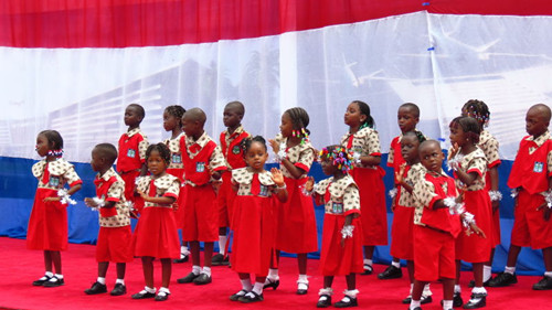 上午十一点四十分,利比里亚罗伯茨国际机场升级改建项目开工典礼如期举行。在张越大使致辞以后,由利比里亚大学孔子学院师生表演了精彩的文艺节目。孔子学院学生组织的利比里亚当地艺术团带来的是具有浓郁利比里亚特色和风情的手鼓和舞蹈,展现了利比里亚人民的勤劳和友好,表达了利比里亚人民对美好生活的向往和追求。利比里亚大学孔子学院志愿者老师和学生共同表演的歌舞《荷塘月色》尽显了中国舞蹈的绚彩华章,表达了中利两国人民互相交流对话,共同建设美好家园的美好愿望,引起了所有与会者的阵阵欢呼声!而由孔子学院教导的利比里亚当地小学Kingdom Heritage Model School(王国传统示范学校)的学生带来的《三字经》,更将中国经典的《三字经》用歌舞的方式加以呈现,非常巧妙地阐释了中国文化内涵,利比里亚孩童熟练地用中英文歌唱《三字经》,传递着中利两国人民交流沟通的美好。整个文艺表演得到了瑟利夫总统及在座官员的充分肯定,掌声雷动,台下观众欢呼声不绝于耳。