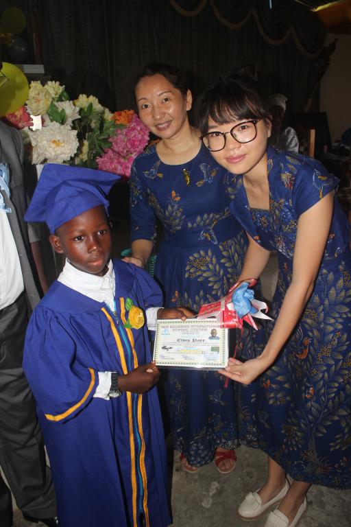毕业典礼气氛热烈,老师们和小学生们载歌载舞,表达内心的欢乐。数名学生代表上台发言,背诵他们学到的知识,他们的表现赢得了老师们激动的拥抱以及家长们的热烈掌声。为表示对中国老师的感激之情,学生们把象征荣誉的花朵和糖果用针别在了两位老师的衣服上。
