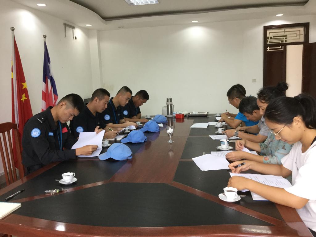 利大孔院中方院长黄柏青博士首先对李亚斌教导员及防暴队的到访表示热烈欢迎,对防暴队长期以来对利大孔院工作的鼎力支持表示衷心感谢。黄柏青院长指出,去年防暴队和孔院联合举办第二届中利武术交流,取得了巨大的成功,得到了中国驻利比里亚大使馆张越大使的高度赞扬,也得到了中资企业、利方官方和民众的高度认可。即将举行的第三届中利武术交流,不仅加深了防暴队与孔院的友谊,也助推了中国文化的传播、中国形象的建立。黄柏青博士还应防暴队的请求介绍了孔院自建院九年以来的发展历程,从注册学生人数、社会影响、毕业学生参与中资企业工作等方面做了全面的回顾。