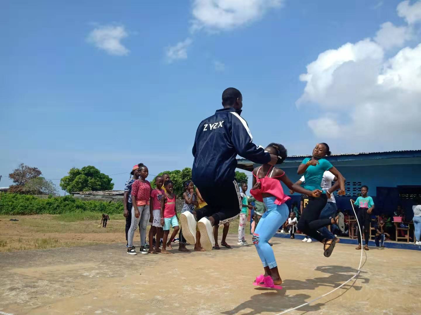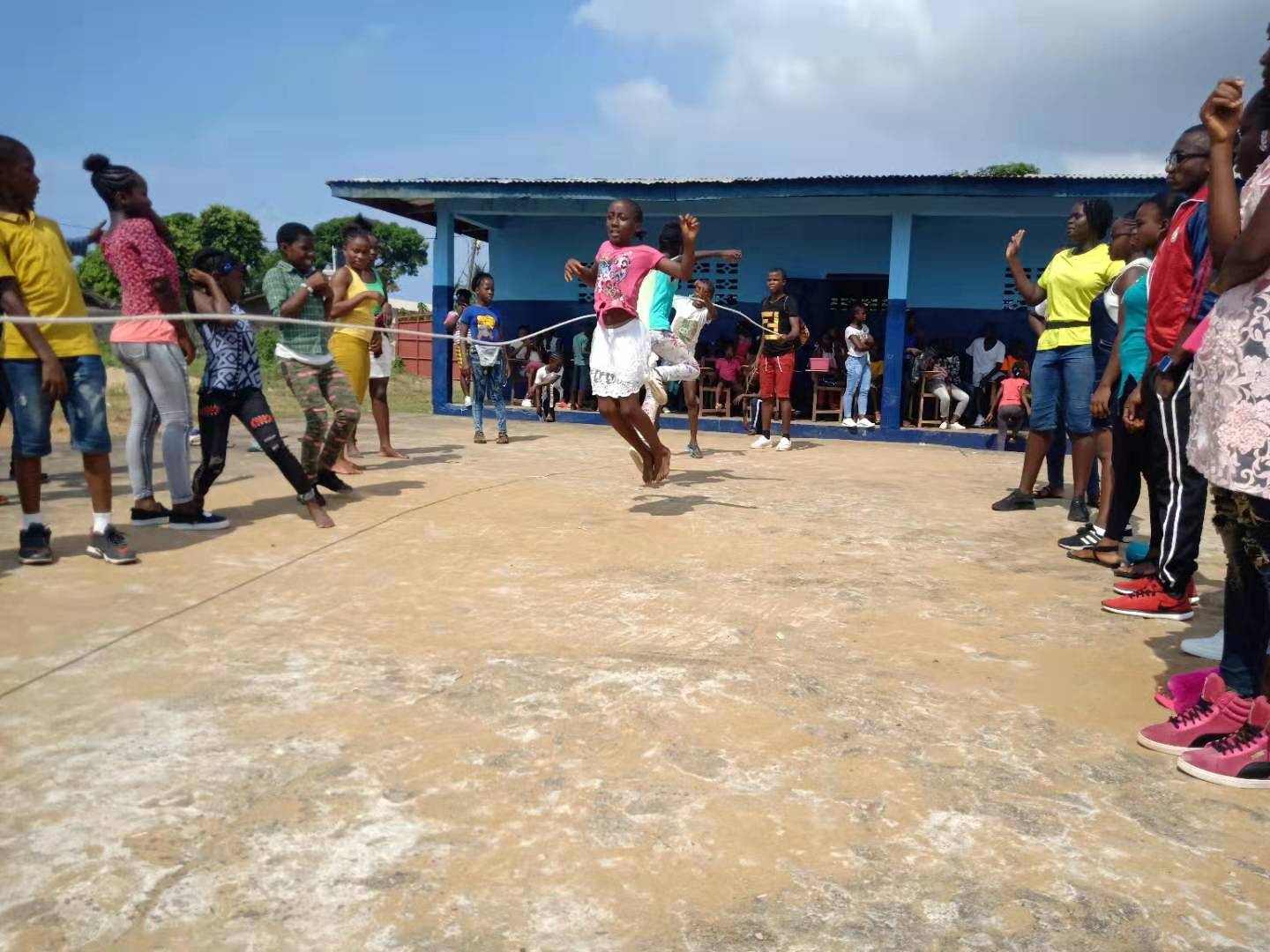 当地时间11月8日,利比里亚大学孔子学院教学点强森中学举行了团体跳绳比赛,由四年级到十年级各班选拔出来的35名选手不惧烈日,为了班级荣誉展开了激烈的比拼。