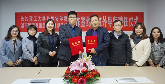 4月7日,为了促进我校英语和翻译专业人才培养,外国语学院段胜峰院长、何健博士与姚尧博士一同前往湖南雅瑞思信息技术有限公司,举行翻译实习基地签约暨校外导师聘任仪式。