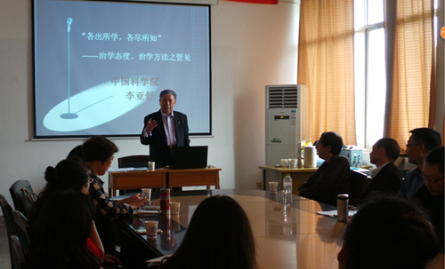 李亚舒教授首先以中国近代铁路工程专家詹天佑为例,讲述了清末留学生为国家富强而不懈努力、自强不息的故事,引出“各出所学、各尽所知”的观点,进而以“两弹一星”元勋郭永怀为国家科技进步而奉献终身的事例阐述了中国科学家的爱国精神。李亚舒教授认为,无论是科学家、翻译家、还是学术研究者都应以国家需要、国家利益为最高目标。最后,李亚舒教授引用费孝通先生的16字箴言“各美其美,美人之美,美美与共,天下大同”,鼓励学术研究者及青年学生要心怀祖国,具有鲜明的文化立场,实现文化自觉。最后,李亚舒教授与在座的师生就学术研究的目的、学者的胸怀等问题进行了交流。