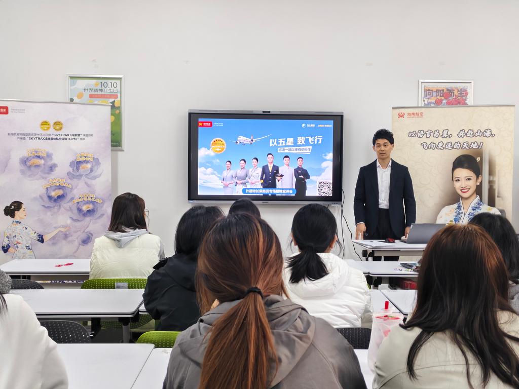 11月25日,外国语学院在3号教学楼220教室开展海南航空外语特长乘务员专场招聘会,吸引全院20余名学生积极参与。