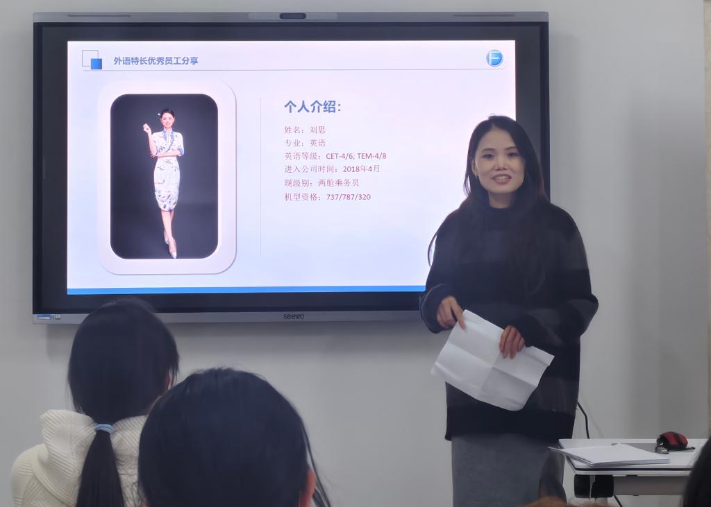 随后,刘思结合面试与航线服务的实际案例,分享了外语能力在跨文化沟通中的应用技巧;蒋怡楠则以其所至国际航行地点为切入点,鼓励同学们将专业优势转化为职业竞争力。