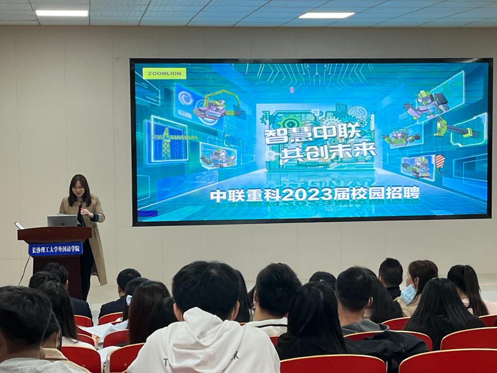 2022年11月1日下午四点半,中联重科工程起重机公司人力资源负责人谢娟萍部长一行人到我校文科楼圆厅A100面向全校师生开展就业交流宣讲会,我院领导高度重视,院党委书记文丽丽、院长段胜峰与来校用人单位进行了深入交流,院党委副书记周芳、副院长季红琴,副院长谭莲香、就业专干龙洋、研究生辅导员陈若晨出席宣讲会,我院2023届本科生及研究生参加宣讲会。