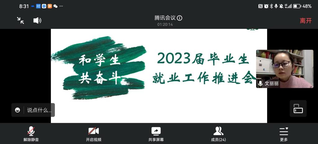 文丽丽对各位导师及班主任对学生工作的支持与付出表示了肯定和感谢。她以自己多年来培养学生成长成才的经验举例,提醒班主任和导师在学生面临人生转折点的关键期要伸出援手,积极整合相关资源帮助学生推荐适合且心仪的工作,鼓励全体导师、班主任积极参与到3月4日春招现场的就业帮扶中来,协力推进2023届毕业生就业工作。