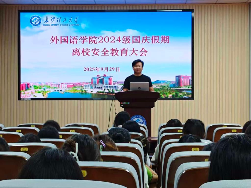 为全面总结2024级本科生上一学年的成长与收获,部署新学期的安排,并重点做好国庆假期的安全稳定工作。外国语学院于9月29日下午在3教321报告厅成功召开2024级年级大会。学院党委副书记周芳、年级辅导员郭恒及2024级全体同学共同参会。