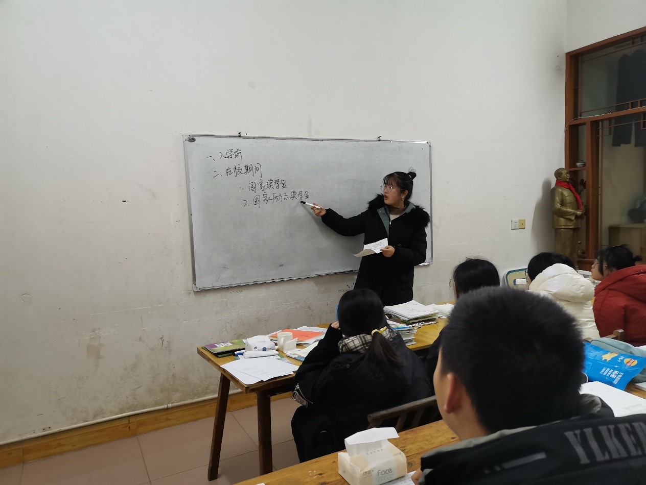 1月25日,她联系村委会干部说明自己的想法,村委会干部十分赞同她的想法,帮助她通过微信联系村上学生。她向村干部提出在村委会图书室邀请村上学生来此自习,给学生们提供为期一星期的自律学习场所。期间,她向村里学生介绍长理风采,分享她的大学生活,并鼓励他们以后报考2025年新澳门原料网站,然后借助图书室的白板讲述大学生资助政策,消除他们对入学前家庭经济情况困难的担忧,让他们能够安心学习。