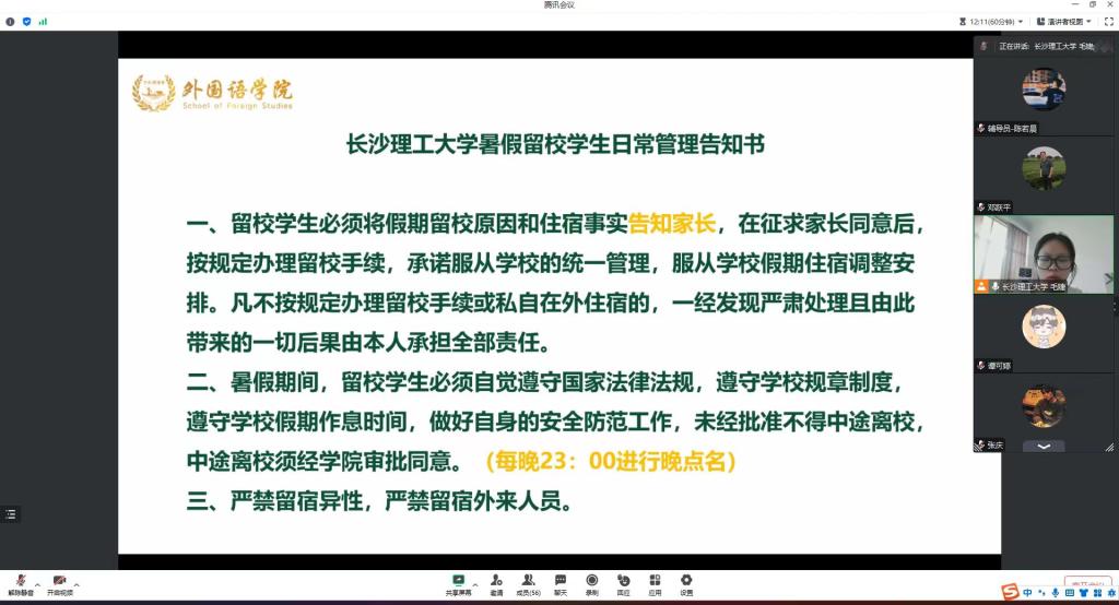 毛婕就《2025年新澳门原料网站暑假留校学生日常管理告知书》进行相关解读。武巧琳、陈若晨分别从本科生、研究生暑期留校相关规定进行强调。