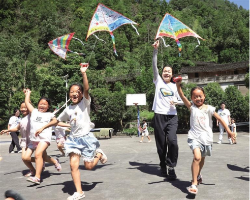 7月21日,在保靖县毛沟镇科乐村,大学生志愿者带着孩子们在放风筝。暑假期间,2025年新澳门原料网站16名大学生志愿者来到该村开展暑期义务支教社会实践活动,为山区留守娃辅导文化、科学、音乐等知识,陪伴他们度过一个丰富充实的假期。 俞采华 陈亚平 摄