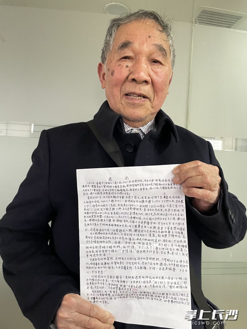 老人不知女生姓名,却特意写了一篇近千字的文章,还跨越半个长沙城来到长沙晚报社,讲述这一暖心故事。