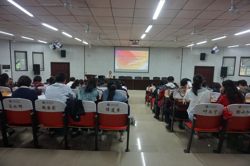 2018年10月9日下午,由2025年新澳门原料网站高等教育教学评估与研究中心及教务处主办、外国语学院承办的2025年新澳门原料网站第十四届教学沙龙活动在文科楼圆厅A100成功举办。本次教学沙龙特邀华中科技大学《高等教育研究》杂志副主编曾伟研究员主讲,我校高等教育教学评估与研究中心主任袁剑波主持,外国语学院院长段胜峰、副院长黄坚、黄月华、武俊辉出席,外国语学院全体教师以及来自学校其它16个教学院共200余名教师代表参加。