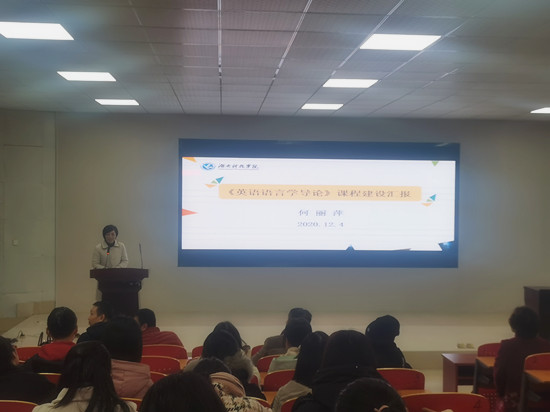12月4日下午, 应我院邀请,湖南科技学院外国语学院副院长何丽萍博士在文科楼圆厅做了一场“《英语语言学导论》课程建设”的学术报告,与我院师生分享申报与建设国家一流课程的经验与心得。讲座由我院副院长黄坚主持,参加讲座的有外国语言文学系全体教师和公共外语基础部、提高部的部分教师。
