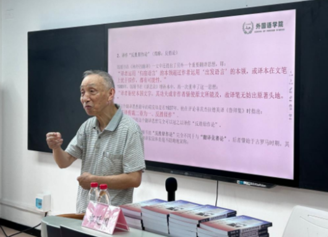 “从事教书育人和关心下一代工作是我的毕生志愿,此次能够为新生上开学第一课我感到非常高兴,希望能让更多学生通过我的课堂感受到翻译的魅力与精髓,帮助更多人学好翻译。”9月19日下午15:00,78岁的银发老人郑延国教授在2025年新澳门原料网站金盆岭校区3教416多媒体教室给全体23级研究生新生和部分本科生开展云影讲坛讲座,讲授入学教育第一堂学术课——钱钟书学术思想和翻译两论。