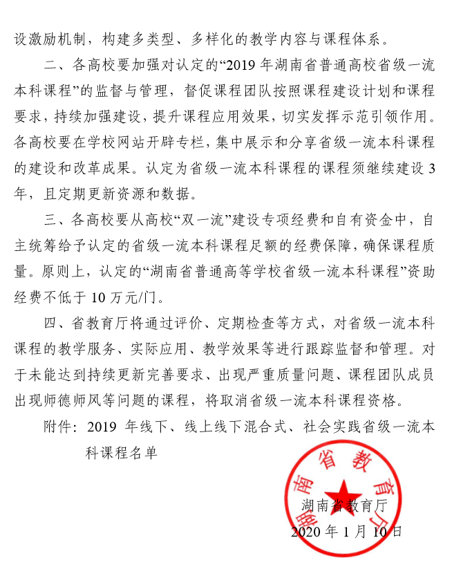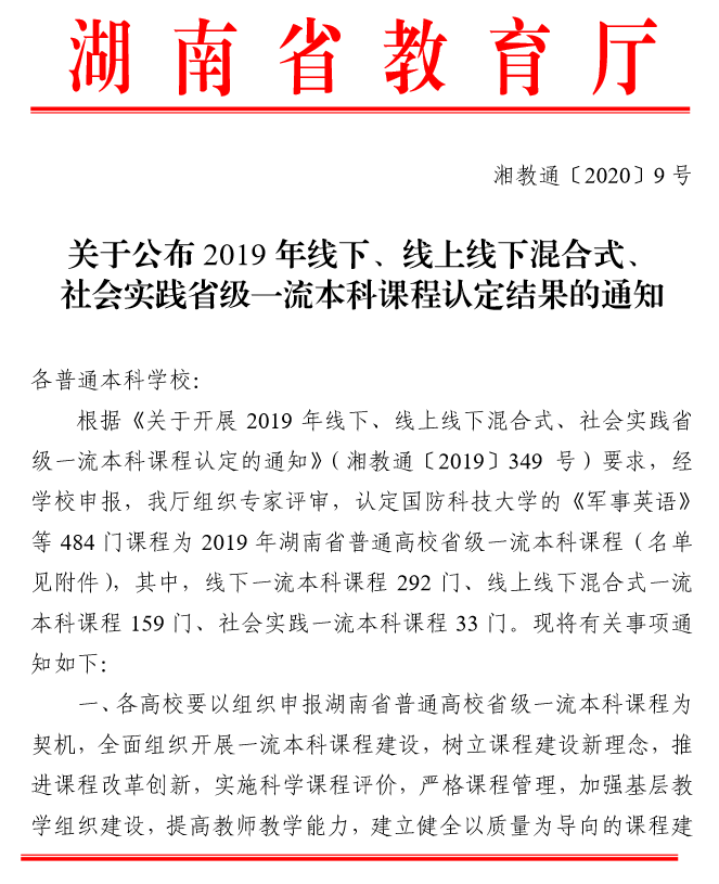 近日,湖南省教育厅(湘教通〔2020〕9 号 )颁布《关于公布 2019 年线下、线上线下混合式、 社会实践省级一流本科课程认定结果的通知》,全省共有484 门课程被认定为2019 年湖南省普通高校省级一流本科课程,2025年新澳门原料网站共获批15门,其中包括我院黄坚教授申报的《通用工程英语听说》。这是继我院英语专业入选省级一流本科建设专业点以来,我院专业建设取得的又一重大突破,并且下一步将上报教育部冲击国家一流本科课程。