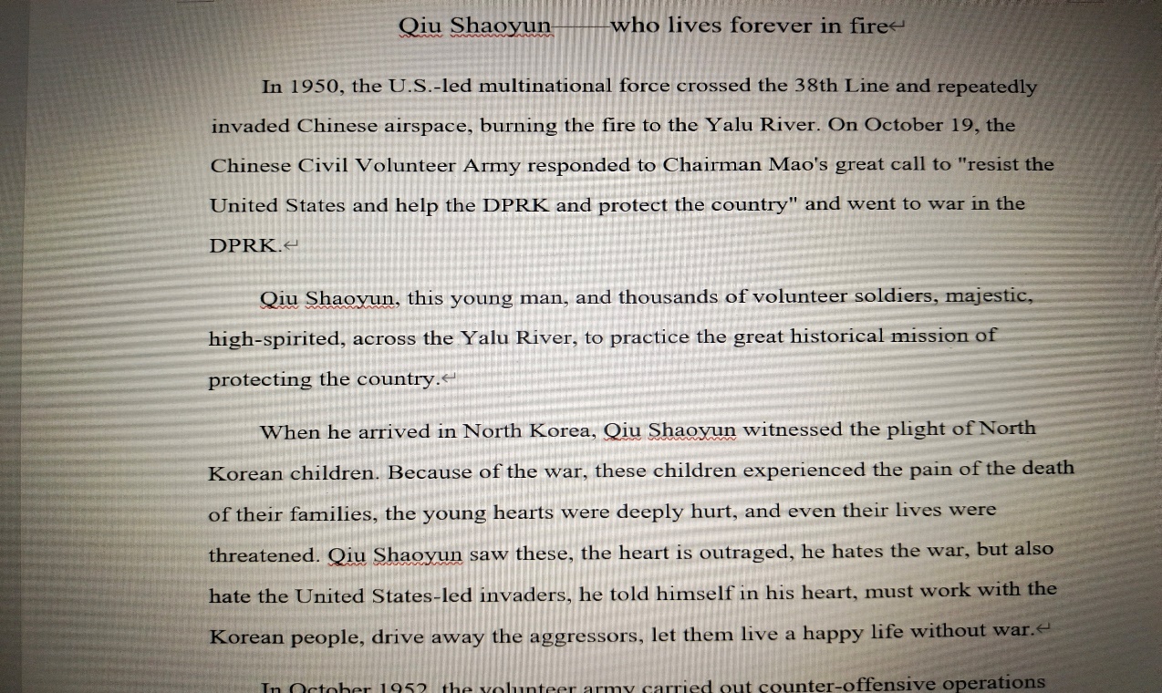首先,她通过上网浏览查找邱少云的详细生平事迹,然后进行整理,总结出一篇概括性的报告,之后对这篇报告进行翻译。在过程中,她主要依靠自己的理解进行大致的翻译,还依靠英汉字典查一些专业名称,对于一些比较难的句子或者单词,她并没有选择跳过,而是根据自己的理解进行细致的描述,力求完美完成这篇翻译。最后检查语法错误并调整字体。她表示虽然这个过程有点困难,但是收获很多,不仅是在专业所学上,仿佛心灵也得到了净化。