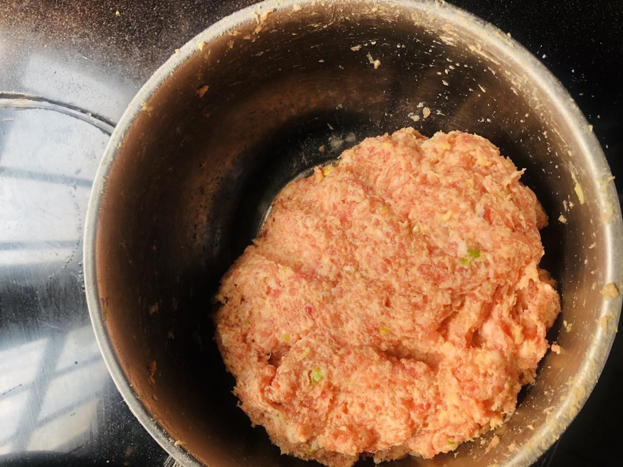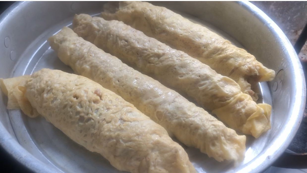 鸡蛋肉卷是家乡一道春节期间必备的美味佳肴,在春节期间的每一次大型聚会的餐桌上总是少不了这一道菜的身影,因为其形状为椭圆形,所以在人们认为这是团圆的象征。今年她也参与了蛋卷的制作。首先是需要准备好制作蛋皮肉卷的食材和配料,包括生粉,盐,八角粉,鸭蛋,搅碎的肉,大蒜叶头,姜,鸡蛋和桃酥等。然后将泡软的桃酥和切成末的蒜叶,姜倒在肉中,加入一点生粉水搅拌均匀做备用,接着就是滚蛋皮,将鸭蛋打成基本不成丝的液体,每次取适量倒入油锅中摊开,这其中最重要的是要把握时机,太慢了蛋皮过厚影响口感。