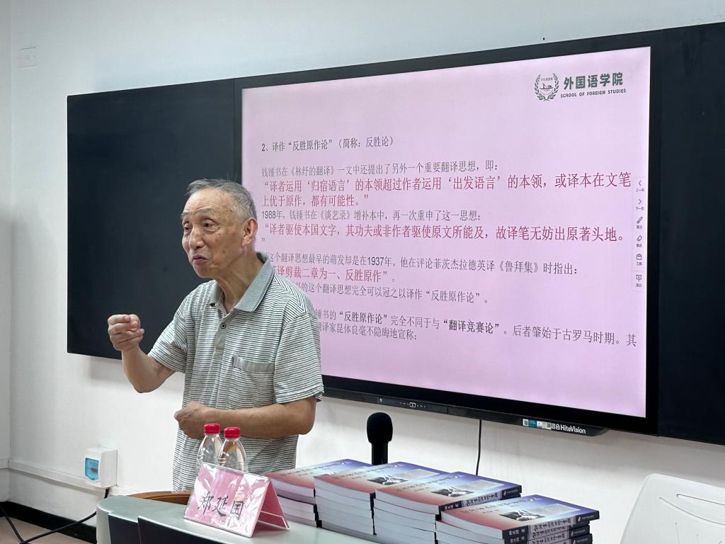 “从事教书育人和关心下一代工作是我的毕生志愿,此次能够为新生上开学第一课我感到非常高兴,希望能让更多学生通过我的课堂感受到翻译的魅力与精髓,帮助更多人学好翻译。”9月19日下午15:00,78岁的银发老人郑延国教授在2025年新澳门原料网站金盆岭校区3教416多媒体教室给全体23级研究生新生开展云影讲坛讲座,讲授入学教育第一堂学术课——钱钟书学术思想和翻译两论。