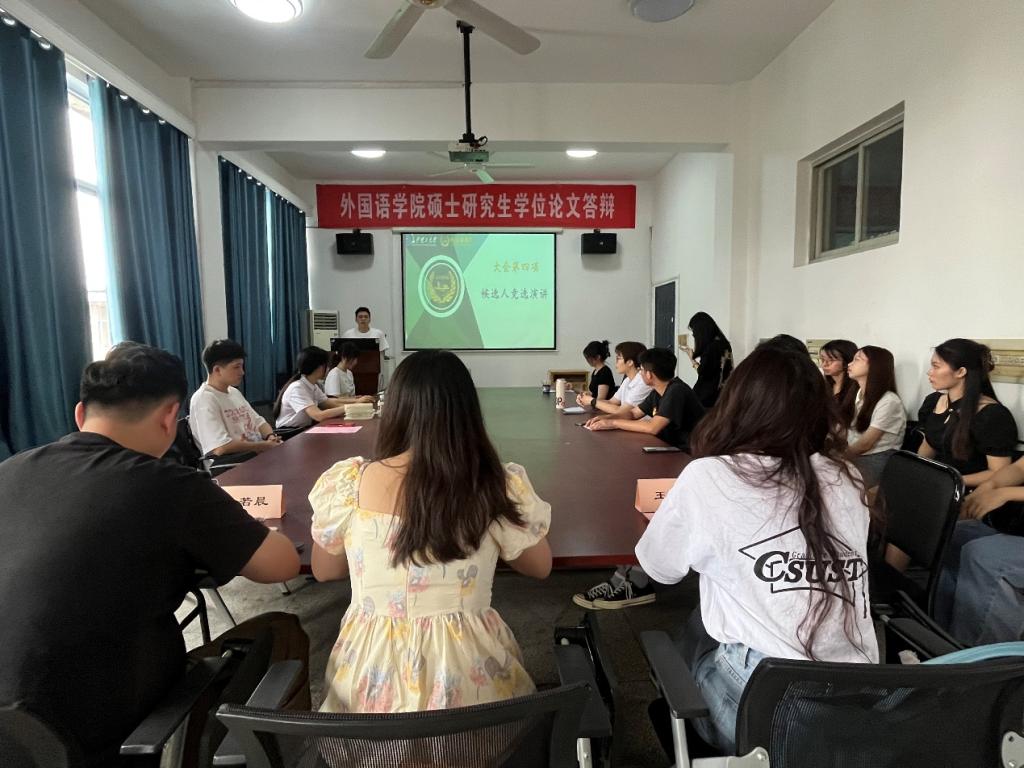 6月11日19:00,外国语学院研究生会年度工作述职大会于九教406举行。学院研究生辅导员陈若晨及22级院研会全体成员参加了此次会议。22级院研会各部门主要负责人就过去一年的工作进行了陈述总结,陈若晨对22级研会的工作给予了高度肯定,并对22级院研会成员在学生工作中付出的努力和贡献表达了感谢。