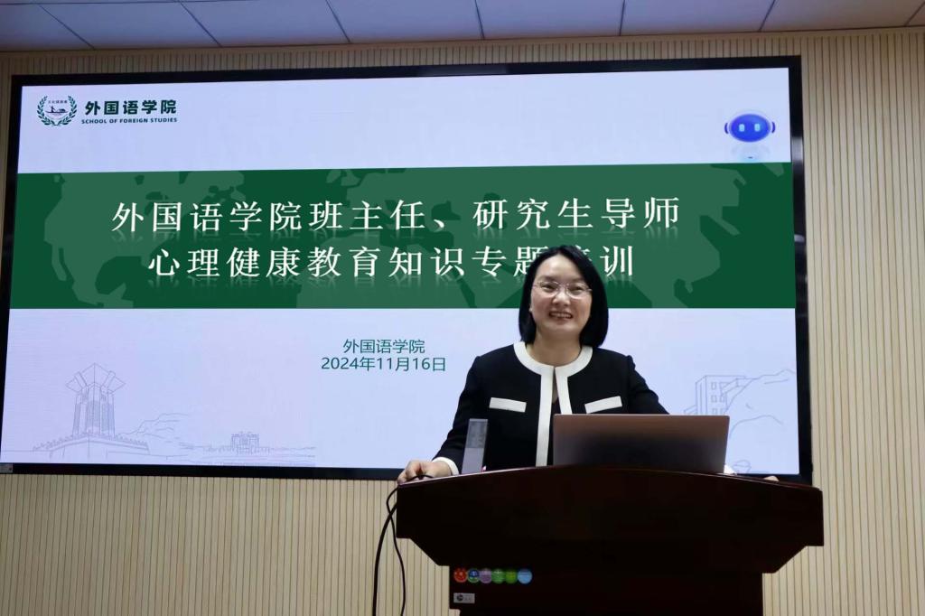 为全面加强大学生心理健康教育,11月16日,外国语学院开展了班主任、研究生导师心理健康知识专题培训。本次培训主题为《心理危机的识别与干预》,主讲人为学院党委副书记、国家二级心理咨询师周芳。