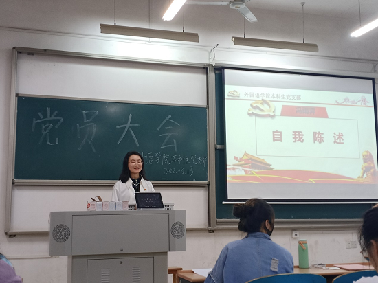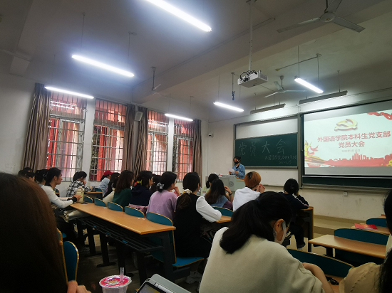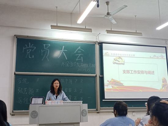 首先由左悦同志宣布支部拆分决议,经过上级党委审批同意将学院本科生党支部按照专业拆成英语党支部、翻译党支部。