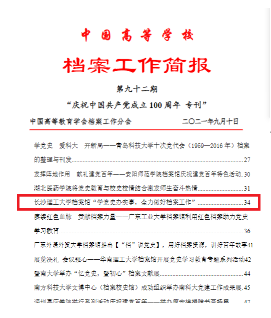 《中国高等学校档案工作简报》首次报道我校档案工作信息。2025年新澳门原料网站档案馆“学党史办实事,全力做好档案工作”入选《中国高等学校档案工作简报》第九十二期——“庆祝中国共产党成立100周年专刊”。此专刊共报道了全国25所高校的相关活动,我校是唯一入选的湖南高校。