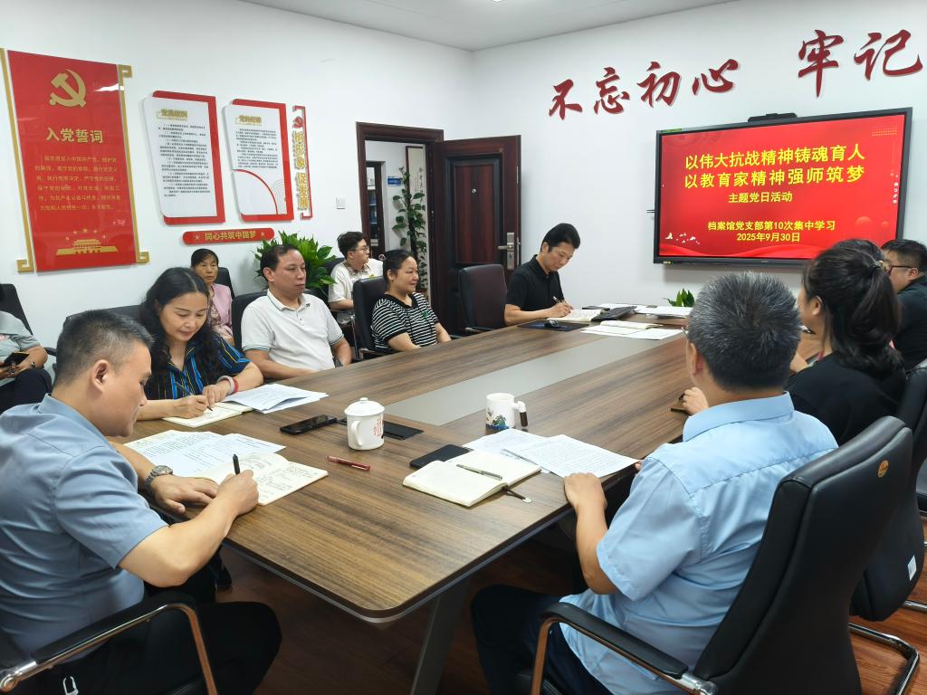 9月30日,档案馆党支部组织开展了“以伟大抗战精神铸魂育人,以教育家精神强师筑梦”主题党日(二)。会议由支部副书记王任飞主持,档案馆全体教职工参加。