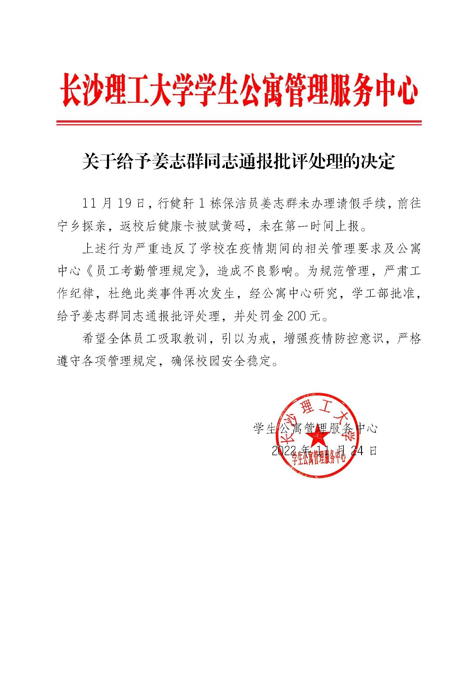 关于给予姜志群同志通报批评处理的决定