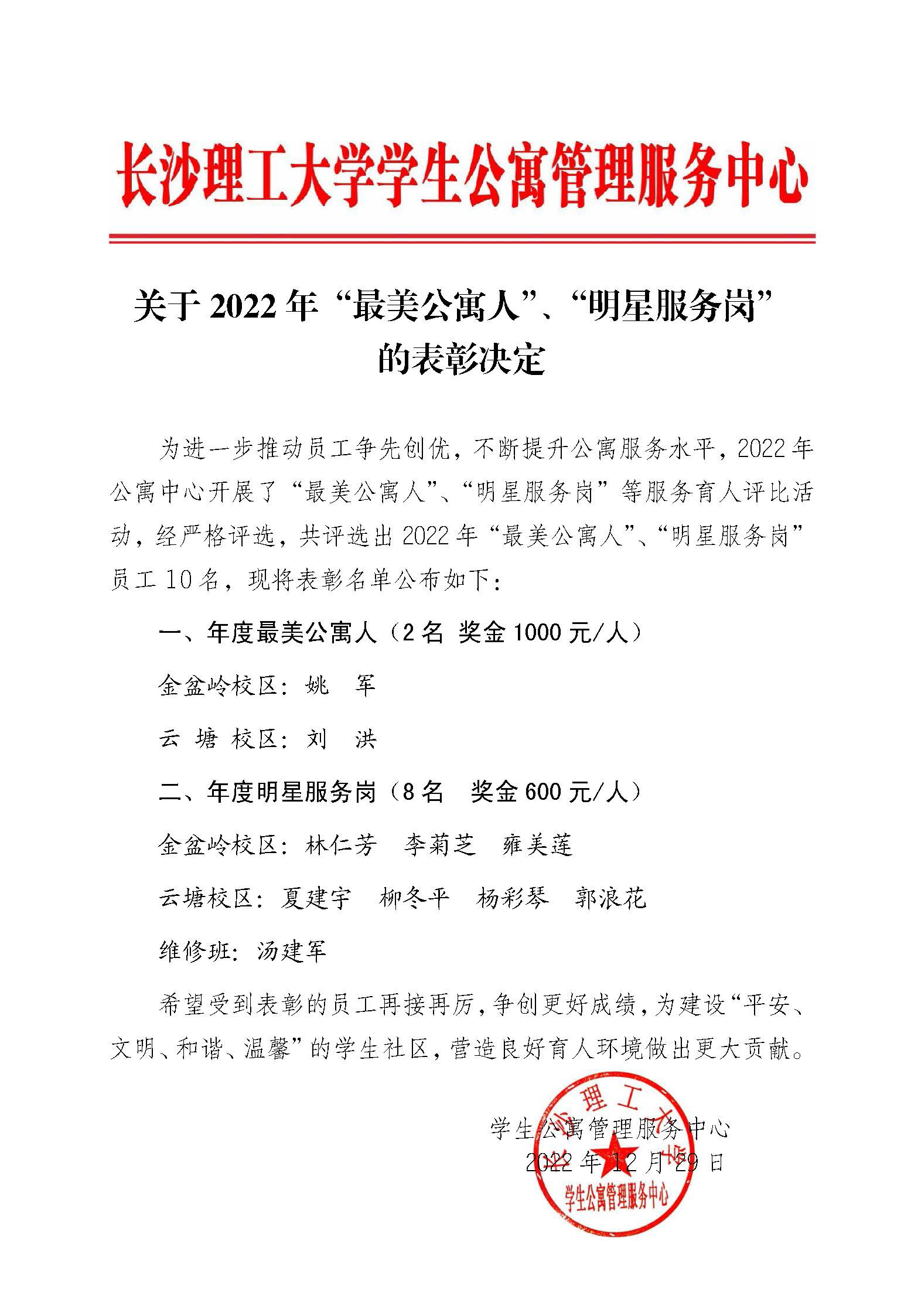 关于2022年“最美公寓人”、“明星服务岗”的表彰决定