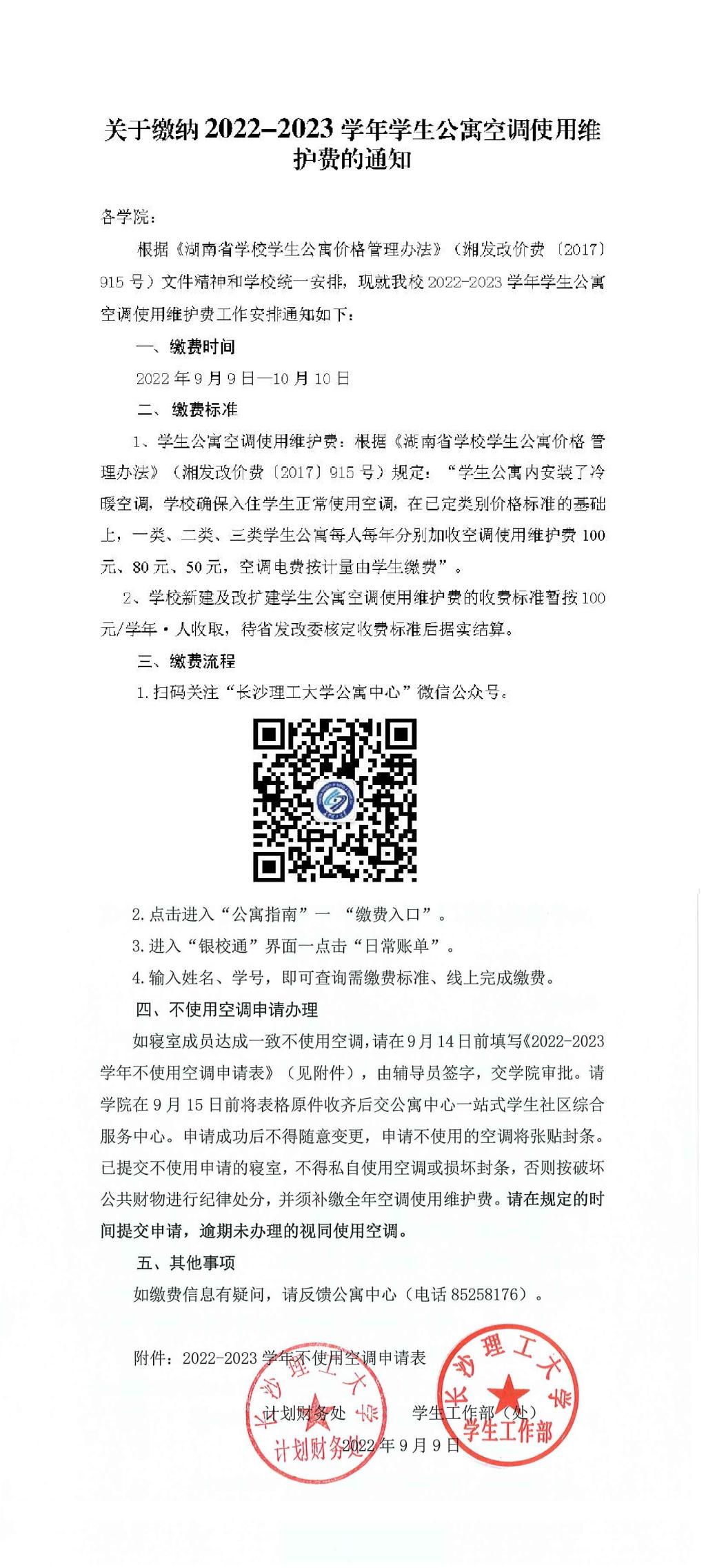 关于缴纳2022-2023学年学生公寓空调使用维护费的通知