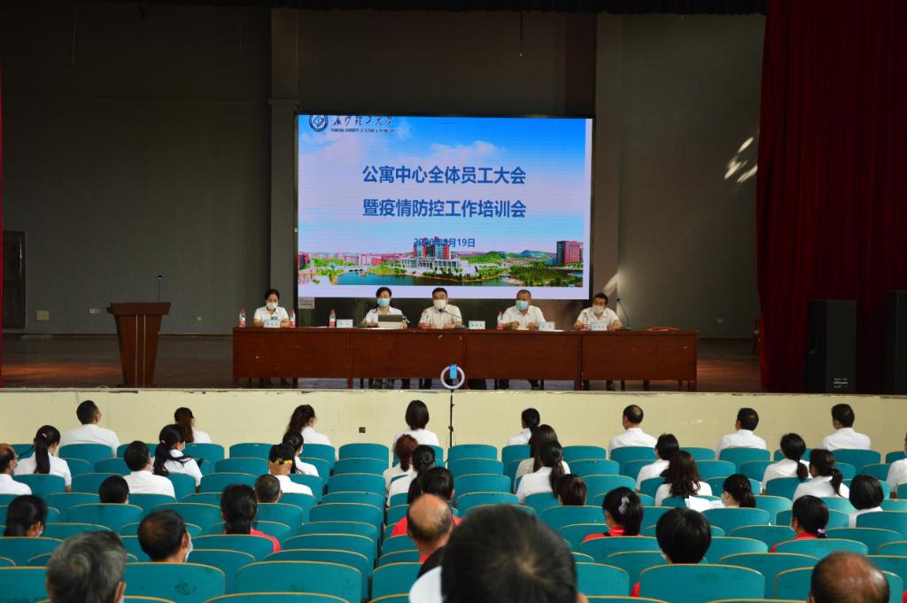 5月19日上午9点,公寓中心采用线上线下的方式,在云塘校区活动中心一楼学术报告厅和金盆岭校区四教报告厅同时召开了新学期全体员工大会暨疫情防控工作培训会。会议由公寓中心副主任阳伶主持。