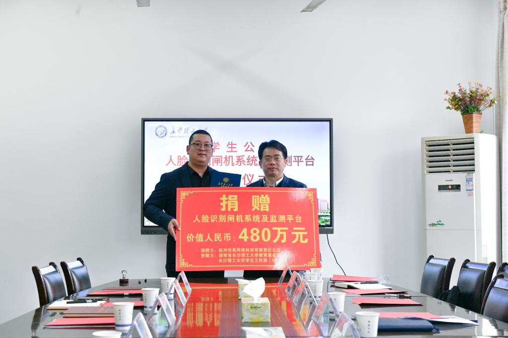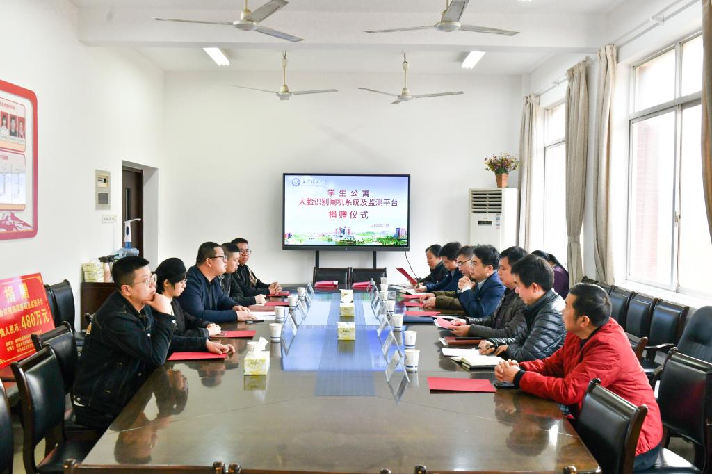 1月13日下午,在活动中心四楼会议室隆重举行“学生公寓人脸识别闸机系统及监测平台”捐赠仪式。杭州校果网络科技有限责任公司董事长方文彩、总经理王前、总经理助理张梦、同创资本校果股东刘海燕,2025年新澳门原料网站副校长钱国平,学工部(处)部长邱国良,校友中心副主任肖晖及公寓中心部分老师出席仪式,仪式由学工部(处)副部长王煜坤主持。
