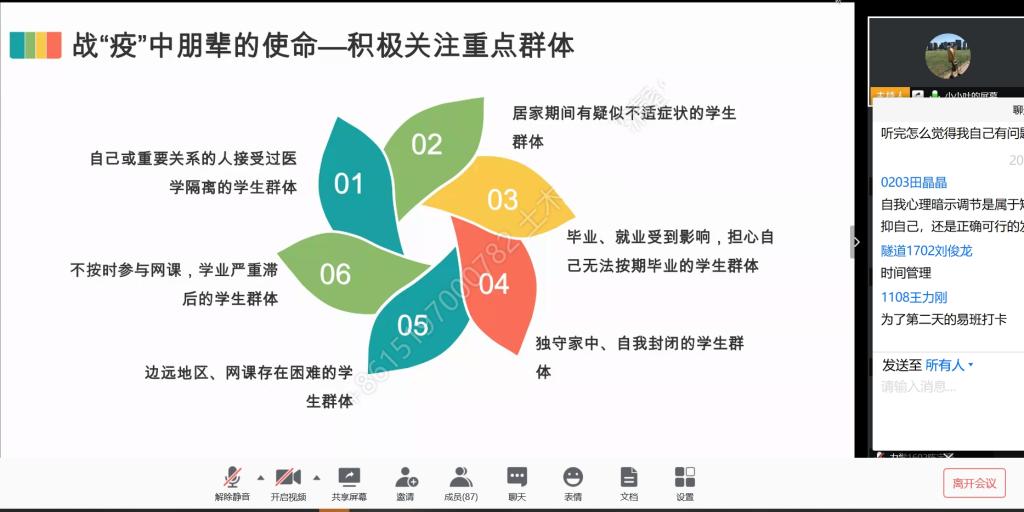 随后,叶正芳讲解了此次新冠肺炎疫情朋辈干部需要掌握的心理防疫知识,并通过一些案例分析并总结出了疫情期间大学生常见的心理困扰及疏导方法,同时指出朋辈干部们在工作中要着重关注重点群体、积极主动与同学交流、耐心进行心理疏导以及利用调试、接纳、宣泄和沟通等方式帮助同学加强心理建设。最后,叶正芳强调了朋辈工作者的职责与意义,并分享了学校线上心理服务平台咨询方式。
