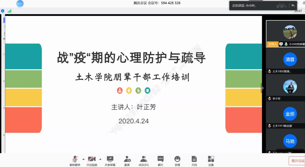为确保学院朋辈干部更加有效帮助班级同学舒缓心理压力,土木学院于424日晚通过腾讯会议平台开展了战疫期的心理防护与疏导线上朋辈干部工作培训。本次工作培训由院心理辅导员叶正芳主讲,学院心理部全体成员、各班级心理委员参加了本次培训。